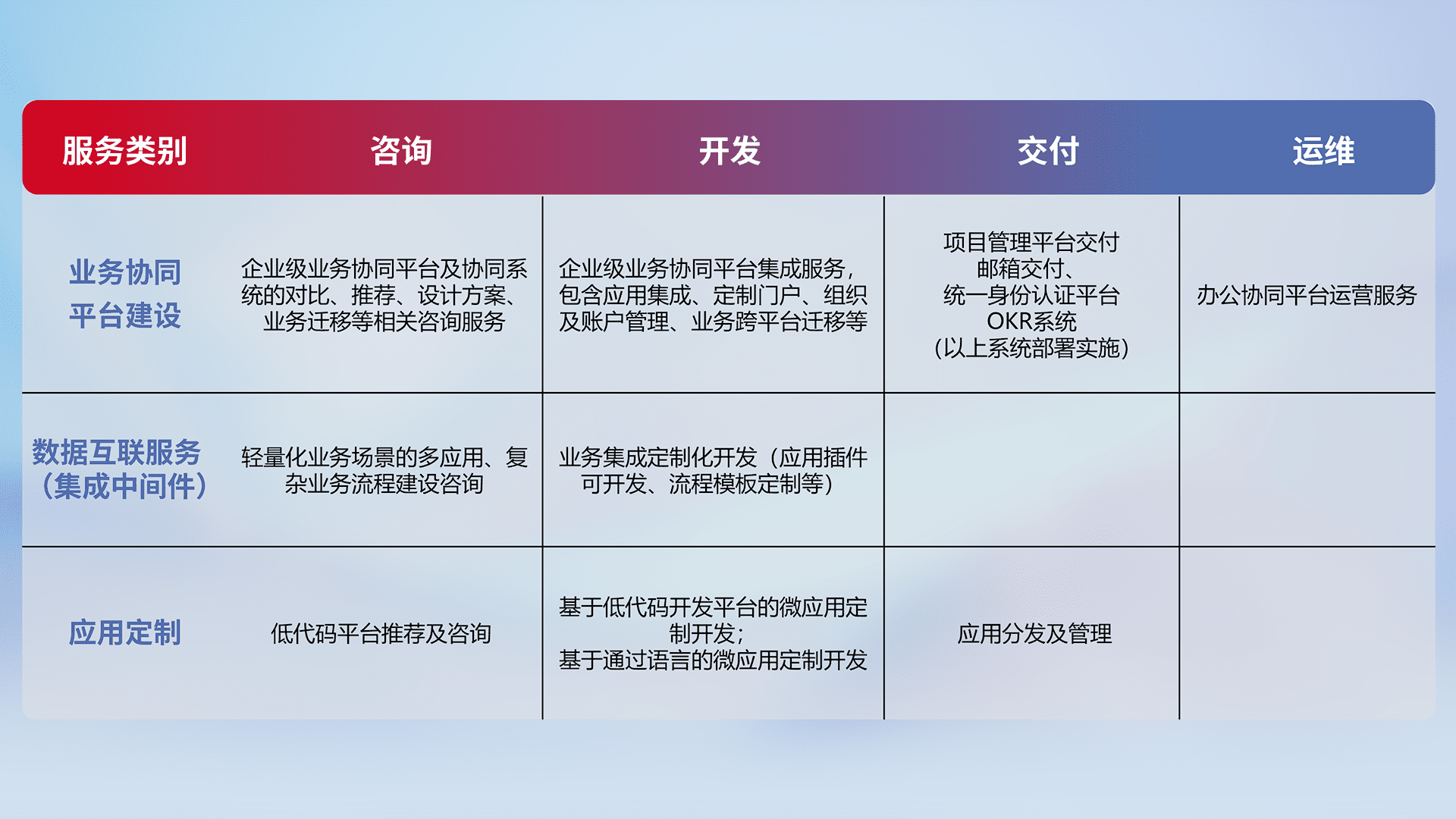 针对钉钉、、、、企微、、IDaas等平台级产品提供产品的规划、、、方案、、、、交付、、定制化开发等服务,,,,实现如统一协同办公、、、智能客户服务、、、混合会议管理、、、、智能数据查询、、、等业务场景,,,,实现数字化转型。。