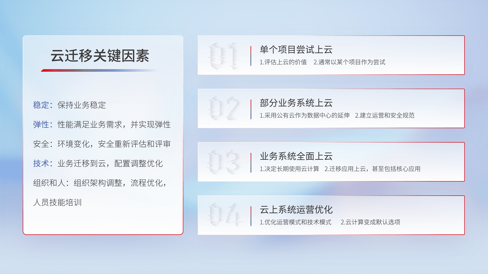 结合实际业务,,,从规划设计、、、、云平台选型、、、云原生改造、、、、数据迁移、、、集成交付,,,迁移全过程为客户识别最佳上云路径,,,做好风险识别管理,,,,设计网络架构、、、、身份权限、、安全审计合规、、、、操作审计、、、、日志审计、、监控告警策略、、、、多站点容灾设计等,,,,对云上基础设施进行整体规划,,,提升IT治理水平,,,,以满足弹性、、高可用、、、、高性能的需求。。。
