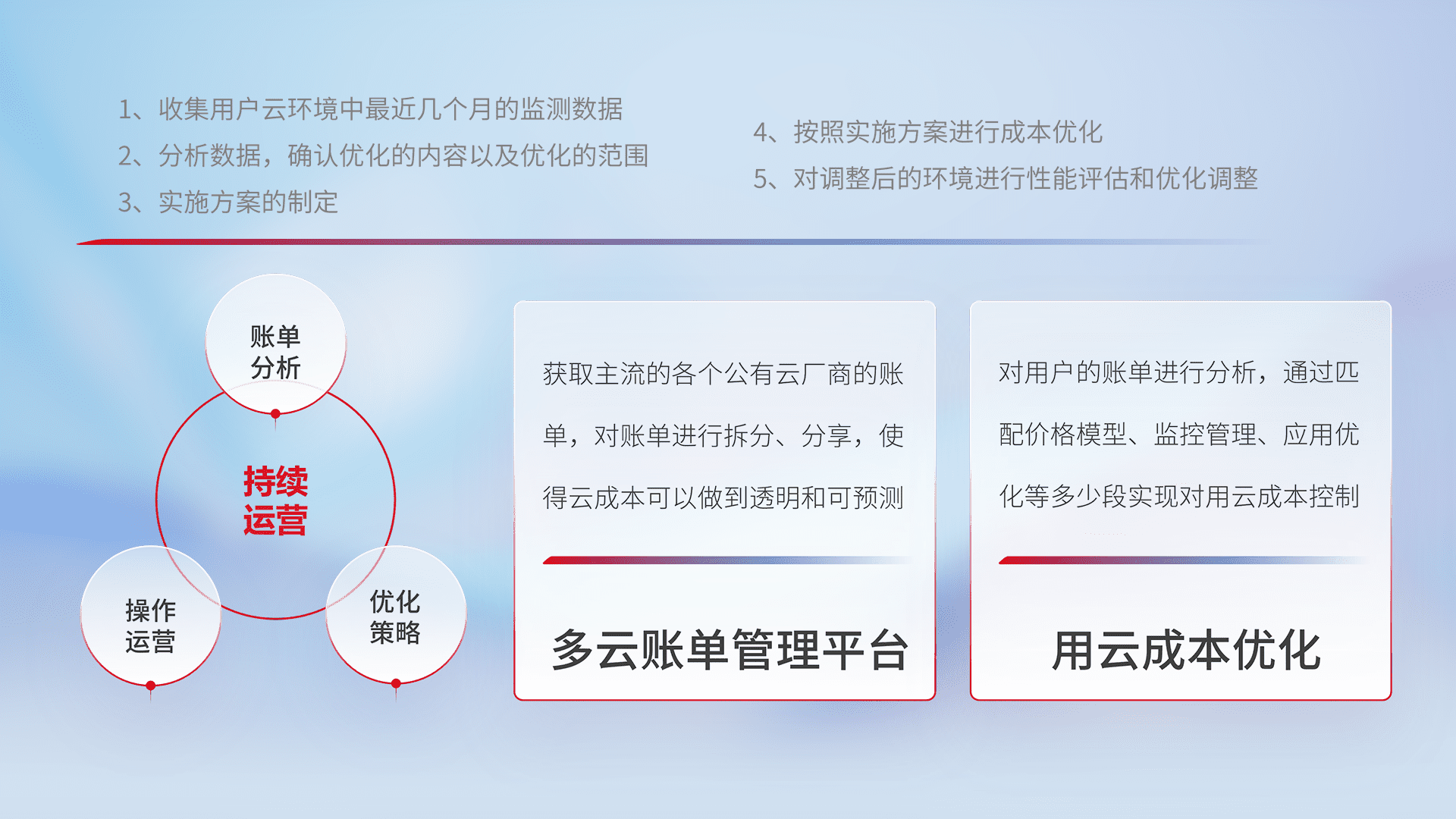 通过多云纳管,,,以统一的资源数据模型把客户的云资源进行抽象和封装,,,进而实现对多云资源的统一操作,,,保障云资源管理的可靠性、、、稳定性与可用性。。。量身定制化运维内容,,配置、、、、开发运维、、、补丁管理、、备份、、监控、、认证和访问管理、、、、审计和日常巡检等,,保障在用云过程中的可靠度,,,,稳定度以及高可用率。。
