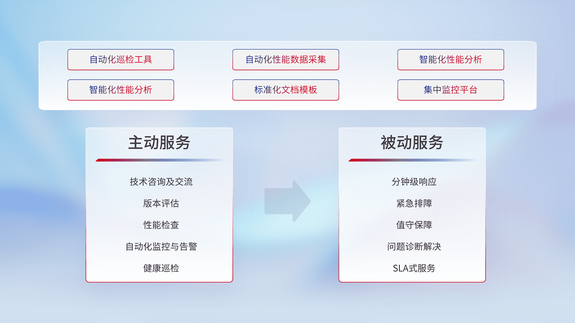 智能化工具和标准化文档,,,,保障服务质量,,,提供主动服务(包含技术咨询、、、版本评估、、、性能检查、、自动化监控与告警、、、、健康巡检)和被动服务包含(分钟级响应、、紧急排障、、、值守保障、、问题诊断解决、、SLA服务)。。。